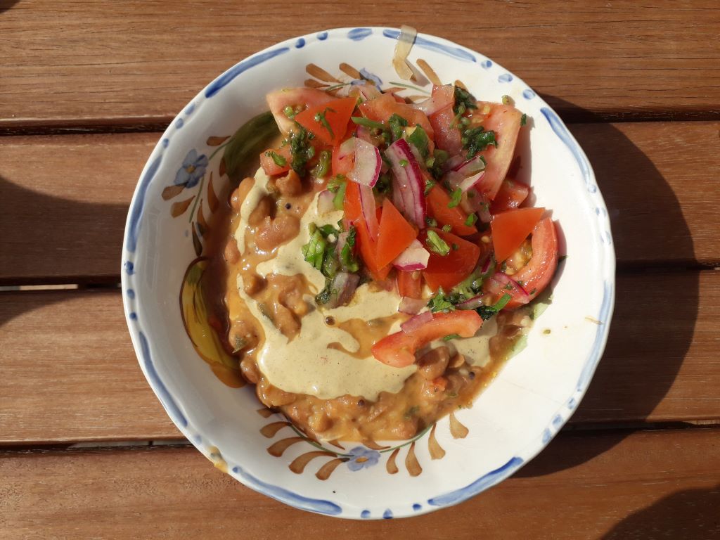 Serve - garnish with a bit of tanina, then herbs + chilli